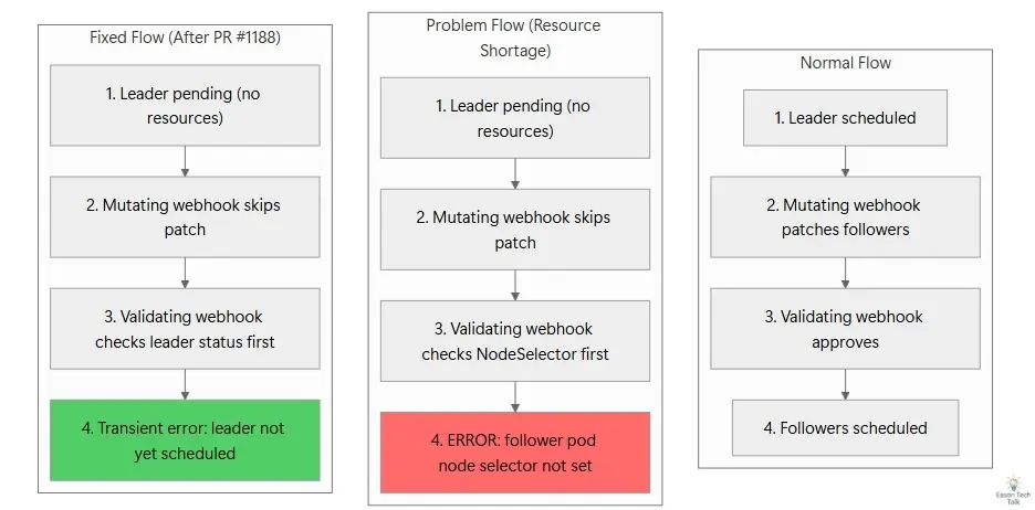 The difference matters. In most event output, users see only the first error returned by the validating webhook and assume the follower Pod is misconfigured. The second message, which comes from the mutating webhook, is the one with real diagnostic value. In stricter environments, detailed mutating webhook logs may be visible only to cluster admins, which makes it even easier for ordinary users to be misled by the admission error.