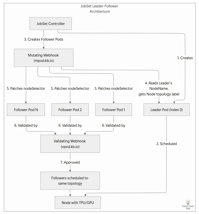When JobSet handles TPU multi-slice workloads or any workload that requires exclusive placement, it uses a leader-follower scheduling model. The core idea is simple: the leader Pod (completion index 0) is scheduled first, and then, when follower Pods are created and enter the admission flow, the mutating webhook reads the topology label from the leader’s node and patches the corresponding nodeSelector onto the follower Pods. This ensures that the followers are scheduled into the same topology domain.