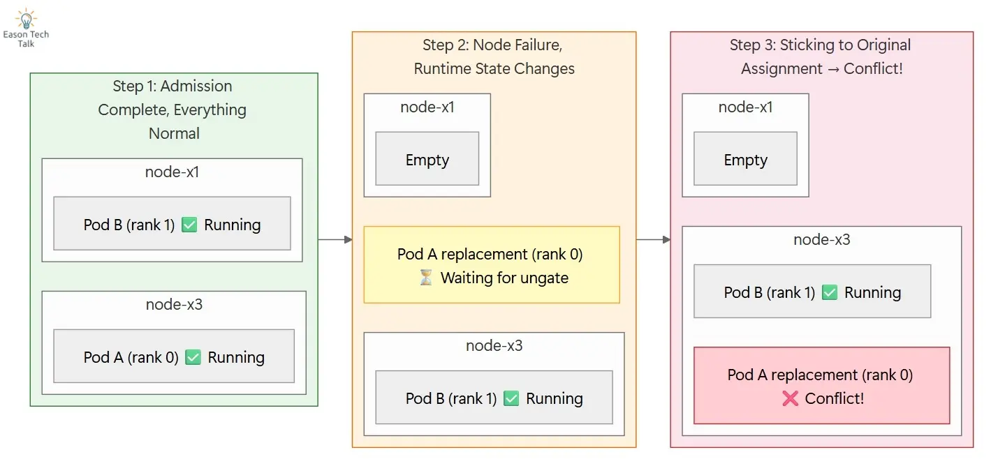 This is not a fabricated edge case. It reflects a real production risk: the topology assignment computed at admission time is a plan, but runtime state may no longer match that plan.